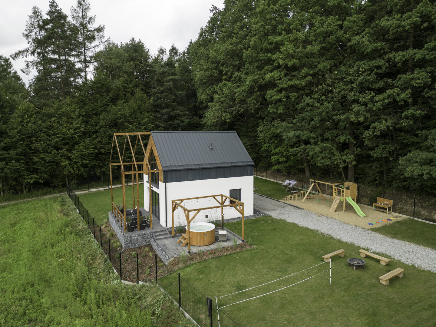 Dodatkowe miejsca do spania znajdują się w salonie, gdzie umieściliśmy rozkładany, dwuosobowy narożnik. Na piętrze, oprócz głównej sypialni, jest także wygodna sofa, która może służyć jako dodatkowe łóżko. Dzięki temu nasz domek jest w stanie komfortowo pomieścić do ośmiu osób, zapewniając każdemu gościowi wygodne miejsce do spania.